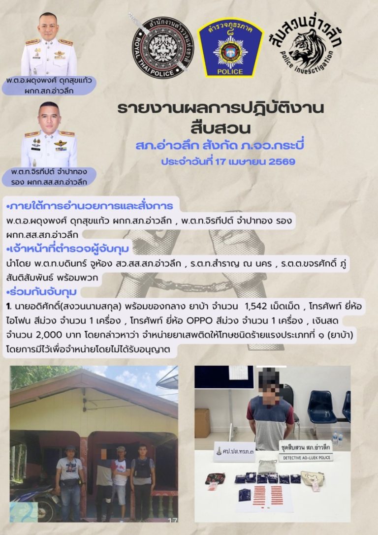 วันนี้ (16 เมษายน 2569) เวลา 09:30 น. พ.ต.อ.ผดุงพงศ์ ดุกสุขแก้ว เข้าร่วมประชุมสรุปผลการดำเนินงานของศูนย์ปฏิบัติการป้องกันและลดอุบัติเหตุทางถนนและทางทะเลช่วงเทศกาลสงกรานต์ พ.ศ. 2569 จังหวัดกระบี่ ณ ห้องประชุมปลายพระยา ศาลากลางจังหวัดกระบี่ โดยมีนายนิรันดร์ ปราบอักษร รองผู้ว่าราชการจังหวัดกระบี่ เป็นป