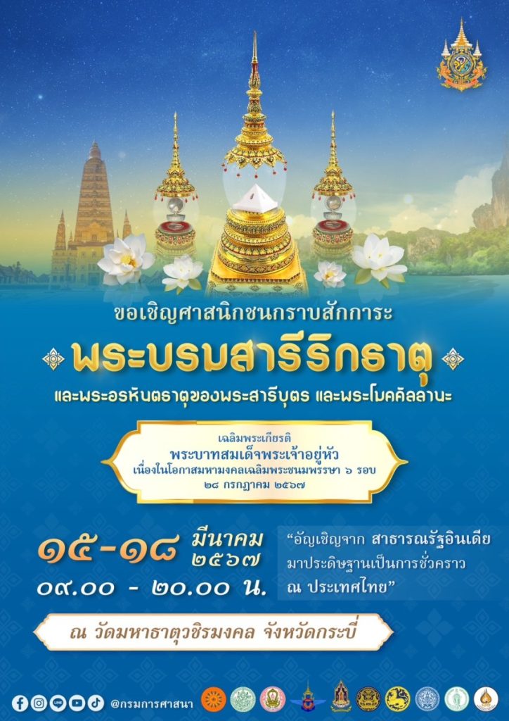 “ครั้งหนึ่งในชีวิต ได้ใกล้ชิดพระพุทธองค์” ขอเชิญพุทธศาสนิกชนทุกหมู่เหล่า ร่วมสักการะพระบรมสารีริกธาตุขององค์สมเด็จพระสัมมาสัมพุทธเจ้า และพระอรหันตธาตุของพระโมคคัลานะและพระสารีบุตร ที่อัญเชิญมาจากพิพิธภัณฑสถานแห่งชาติอินเดีย สาธารณรัฐอินเดีย มาประดิษฐาน ณ วัดมหาธาตุวชิรมงคล (วัดบางโทง) ตำบลนาเหนือ อำเภออ่าวลึก จังหวัดกระบี่ ระหว่างวันที่ 15 – 18 มีนาคม 2567 เฉลิมพระเกียรติพระบาทสมเด็จพระเจ้าอยู่หัว เนื่องในโอกาสมหามงคลเฉลิมพระชนมพรรษา 6 รอบ